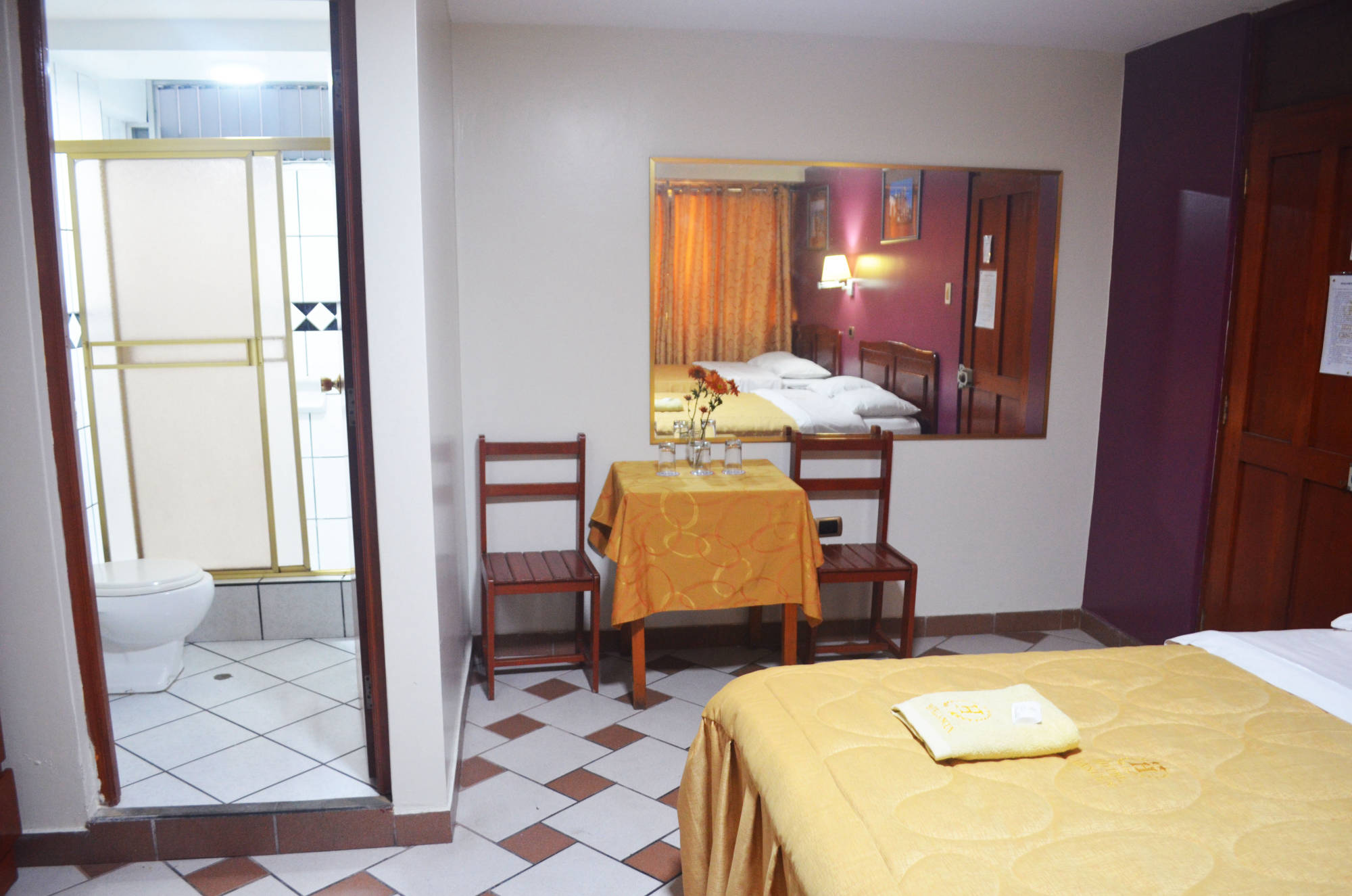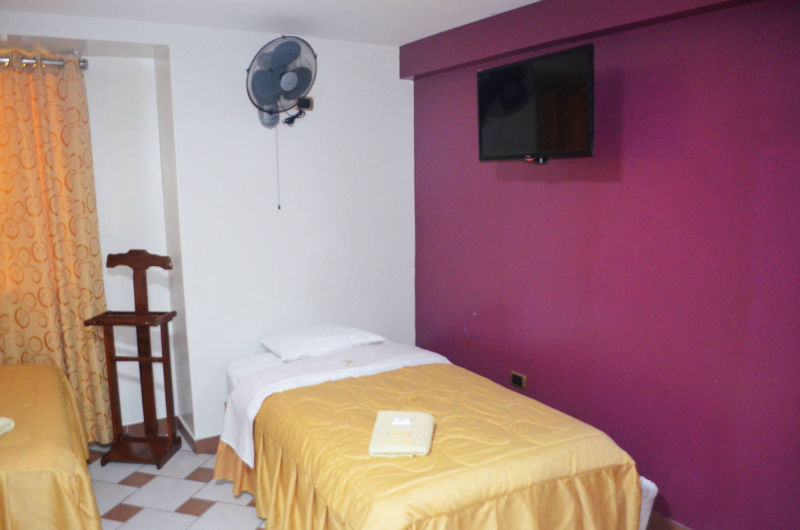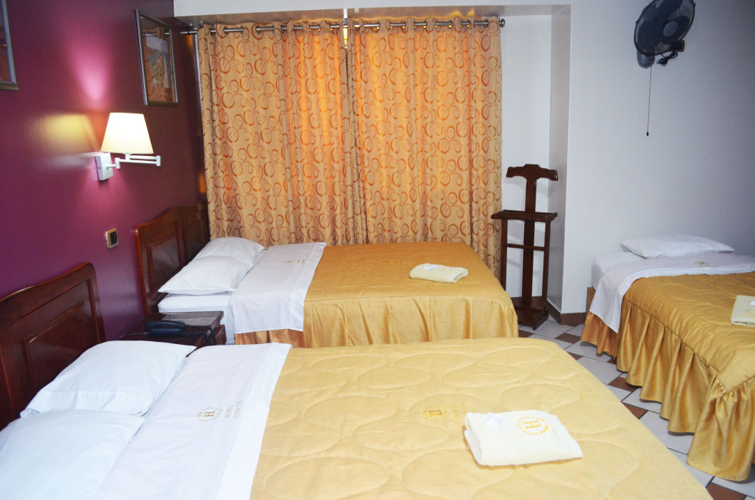 - 2 camas de 2 plazas, 1 cama de 1 1/2 plaza. - Velador, ropero. - Ventilador, lámpara de mesa. - Tv Cable. - Baño y ducha privada. - Agua fría y caliente. - Mesa, 2 vasos y 2 sillas. - Teléfono a recepción